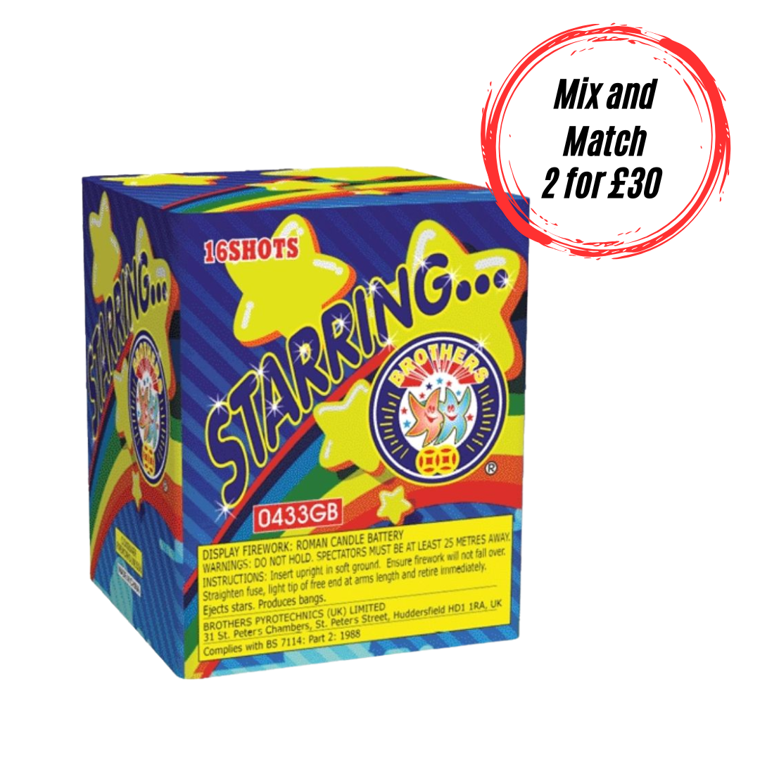 Starring by Brothers Pyrotechnics brings 16 golden comets soaring into the skies and bursting into a frenzy of red, green, gold, and blue to create the effect that will surely impress any spectator! This barrage is perfect for any occasion.