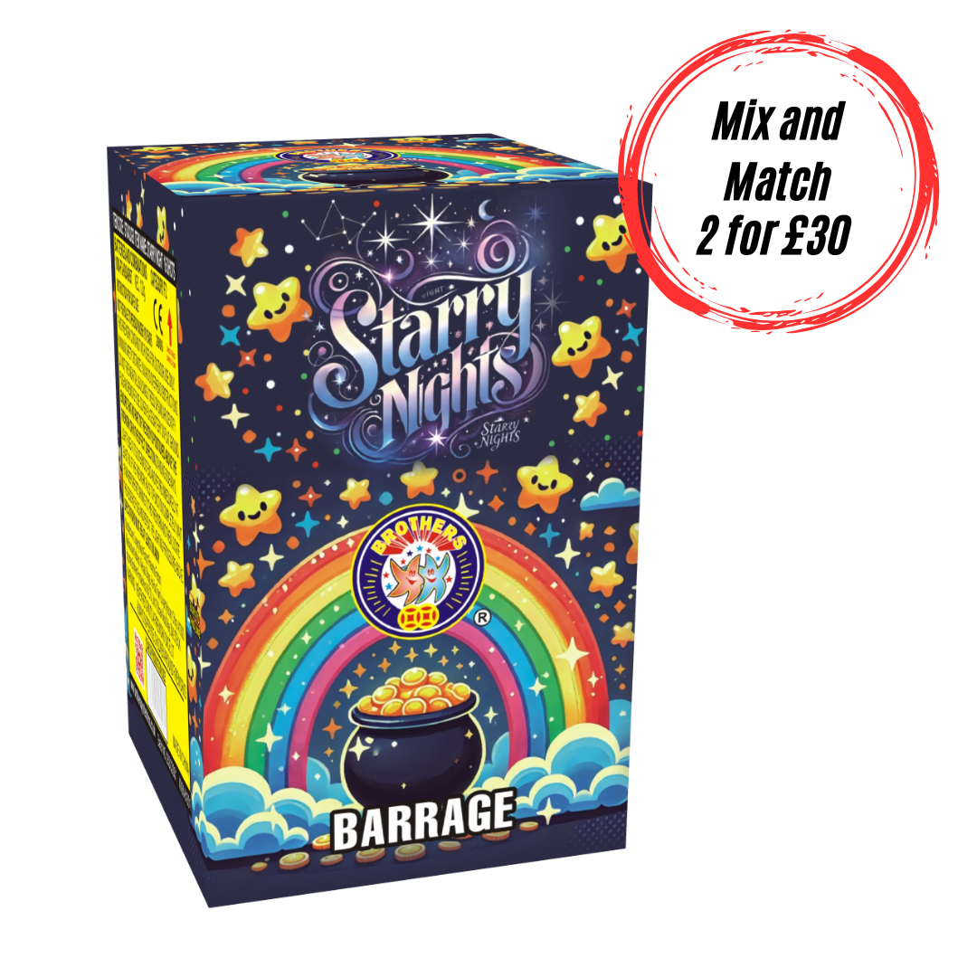 Bring a touch of magic to your display with Starry Nights, a brand-new 16-shot cake firework that delivers a stunning sequence of effects over approximately 30 seconds. Perfect for garden displays or as part of a larger show, Starry Nights fires a series of bright bursts that light up the sky with shimmering stars and colour.